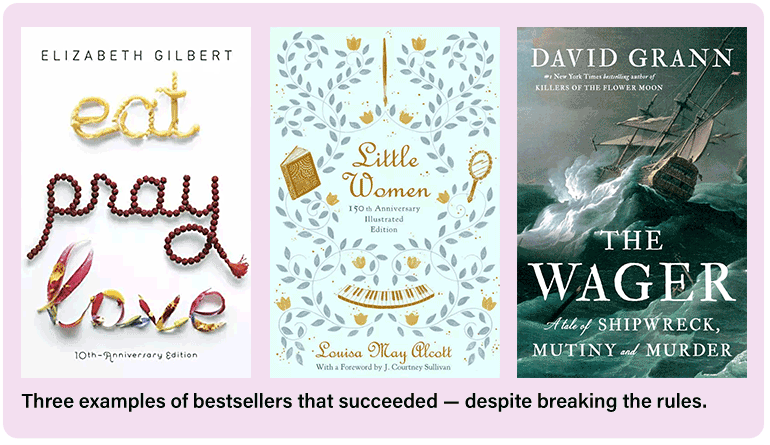 In the graph at the top, only 10% of bestsellers we’ve studied have plot turns that fall entirely within the white band. By contrast, 90% of bestsellers contain at least one emotional high point that extends into the top tint block (representing positivity) as well as at least one emotional low point that extends into the bottom tint block (representing setbacks or gloom).