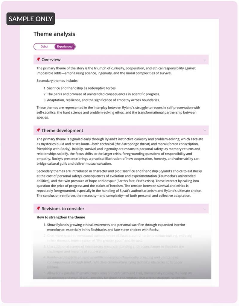 When you subscribe to Marlowe Pro , you’ll see Marlowe’s analysis of your manuscript’s major themes and recommendations.