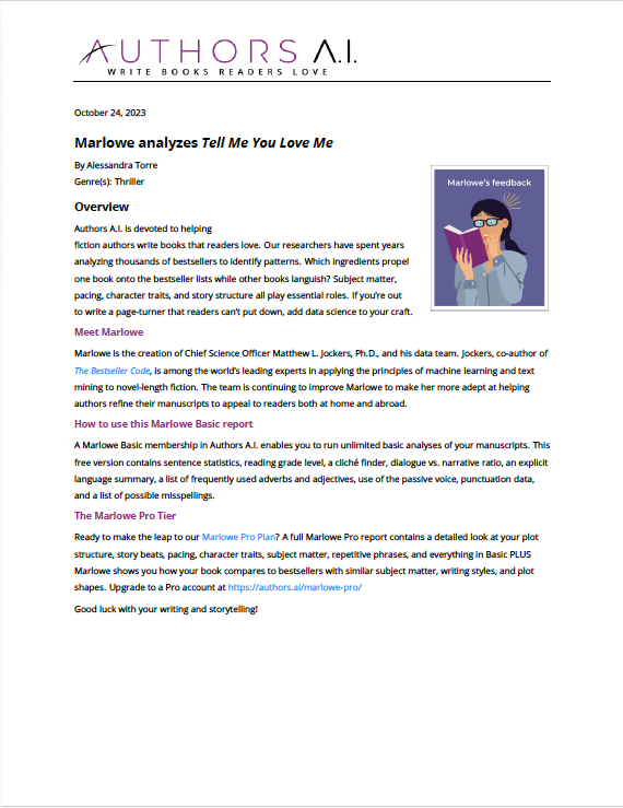 Marlowe is an artificial intelligence that helps authors improve their novels and long-form fiction. She was created in January 2020 by Matthew Jockers, Ph.D., co-author of The Bestseller Code, abetted by a surrounding cast of bestselling authors who have been contributing ideas and enhancements to her reports.